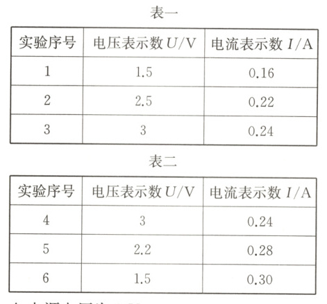 AD 解析:用伏安法测量小灯泡电功率的实验中,将小灯泡与滑动变阻器串联接入电路,表一在通过小灯泡的电流逐渐增大时,电压表示数在逐渐增大,表二在通过小灯泡的电流逐渐增大时,电压表示数在逐渐减小,由于小灯泡的阻值随温度的升高而增大,在实验过程中小灯泡的温度越来越高,小灯泡电阻在逐渐变大,可知:表一是实验过程中将电压表并接在了小灯泡两端记录所得数据,表二是实验过程中将电压表并接在了滑动变阻器两端记录所得数据。结合表一、表二在电流表示数为0.24 A时,电压表示数分别为3 V、3 V,由串联电路的电压规律可知电源电压$U = 3V + 3V = 6V$,故A正确;由题知,小灯泡的额定电流为0.28 A,对应表二电压表示数为2.2 V,可知小灯泡的额定电压为$6V - 2.2V = 3.8V$,故B错误;由欧姆定律$I=\frac{U}{R}$可知,正常发光时,小灯泡的电阻$R=\frac{U}{I}=\frac{3.8V}{0.28A}=13.6\Omega$,故C错误;小灯泡正常发光消耗的电功率$P = UI = 3.8V×0.28A = 1.064W$,故D正确。