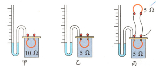 (2)选用乙、丙组合,串联在电路中,此时右边两个电阻并联后再与左边的电阻串联(如图所示),由并联电路的电流特点可知通过乙容器中5Ω电阻的电流大于通过丙容器中5Ω电阻的电流,当在通电时间相同的情况下,发现乙装置U形管中液面高度变化大,可以得出的结论是:在电阻和通电时间相同的情况下,通过导体的电流越大,产生的热量越多。