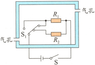 5.(2023·潍坊中考)恒温箱广泛应用于医疗、科研、化工等行业部门,如图所示为某恒温箱的工作原理图。S为电源开关,通过控制温控开关$S_{1}$可实现“保温”“加热”两个挡位间的切换。电源电压$U = 220 V$,$R_{1}$、$R_{2}$是电热丝,$R_{1}=440 Ω$,“加热”时恒温箱的电功率$P_{加热}=550 W$。将恒温箱两气孔封闭,闭合开关S,$S_{1}$置于“加热”挡位,箱内温度从20℃升至设定的恒温温度,用时130 s,该段时间内的加热效率$\eta = 80\%$。恒温箱的容积$V = 2 m^{3}$,箱内空气密度$\rho = 1.3 kg/m^{3}$,箱内空气的比热容$c = 1.0×10^{3} J/(kg·℃)$。求: