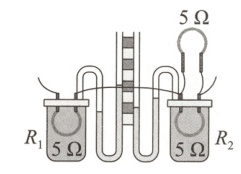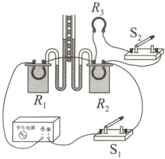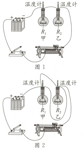 10在实验中,为了探究“电流通过导体产生的热量与哪些因素有关”,按照如图1、2所示安装实验器材,其中甲、乙两玻璃瓶内装有初始温度相同、质量相等的煤油,内部各装有电阻R₁和R₂(R₁ > R₂)。