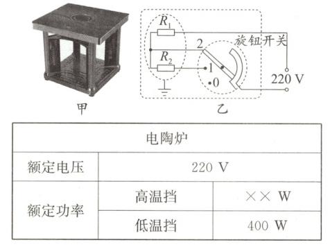 12(兰州中考)一款内置电陶炉的电暖桌如图甲所示,它不仅具有桌面暖手、桌底暖脚功能,还可以烧水、煮茶等。电陶炉的简化电路如图乙所示,其参数如表所示,高温挡额定功率字迹已被磨损。旋转旋钮开关,可实现停止工作、低温挡和高温挡的转换。R₁和R₂均为电热丝,R₂ = 72.6 Ω。求:
