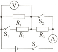 解析:当闭合开关S,断开开关S₁、S₂时,R₁和R₃串联,电压表测R₁两端的电压,电流表测串联电路电流;电压表的示数为4V,电流表示数为0.2A,则R₁的阻值为:R₁ = $\frac{U_{1}}{I_{1}}$ = $\frac{4V}{0.2A}$ = 20Ω;根据串联电路电压规律及欧姆定律可知,电源电压为:U = U₁ + I₁R₃ = 4V + 0.2A×10Ω = 6V。当开关S、S₁、S₂都闭合时,R₁和R₂并联,电压表测电源电压,电流表测干路电流;根据欧姆定律可知,通过R₁和R₂的电流为:I₁' = $\frac{U}{R_{1}}$ = $\frac{6V}{20Ω}$ = 0.3A,I₂ = $\frac{U}{R_{2}}$ = $\frac{6V}{30Ω}$ = 0.2A,故干路电流为:I = I₁' + I₂ = 0.3A + 0.2A = 0.5A,则电路消耗的总功率为:P = UI = 6V×0.5A = 3W。