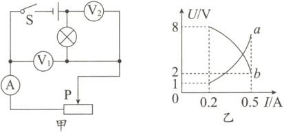 解析:由题图甲可知,灯泡与滑动变阻器串联,电压表V₁测量滑动变阻器两端的电压,电压表V₂测量灯泡两端的电压,电流表测量电路电流。滑片向左移动,滑动变阻器接入电路中电阻变小,由串联分压原理可知,滑动变阻器两端的电压变小,电源电压不变,由串联电路的电压规律可知,灯泡两端的电压变大,电路中总电阻变小,电路电流变大,则曲线a为灯泡的U - I关系图线,曲线b为滑动变阻器的U - I关系图线,即曲线a为电压表V₂示数与电流表示数的关系图象,曲线b为电压表V₁示数与电流表示数的关系图象,故A错误;由图象可知,当灯泡电压为1V时,变阻器电压为8V,则电源电压U = UL + UP = 1V + 8V = 9V,故B错误;闭合开关S,将滑动变阻器的滑片P从最右端滑至灯泡正常发光的位置,由图象可知,当灯泡正常发光时,电路电流为0.5A,滑动变阻器两端的电压为2V,由欧姆定律得滑动变阻器接入电路的阻值为RP' = $\frac{U_{P}'}{I'}$ = $\frac{2V}{0.5A}$ = 4Ω,故C错误;当灯泡正常发光时,电路电流为0.5A,滑动变阻器两端的电压为2V,灯泡的额定电压UL = U - UP' = 9V - 2V = 7V,额定功率为PL = UL I' = 7V×0.5A = 3.5W,故D正确。