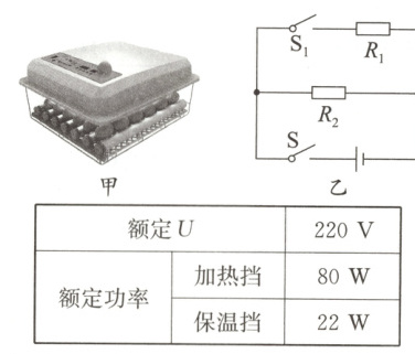 4.(2024·深圳中考)如图甲所示是某款鸡蛋孵化器,底部装有加热器。通电后,加热器对水加热,水向上方鸡蛋传递热量,提供孵化所需能量。孵化器简化电路如图乙所示,$R_{1}$、$R_{2}$都是发热电阻,孵化器相关参数如表所示。