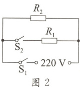 3.(靖江一模)小明家新买的空气炸锅,具有高温、低温两个挡位,内部的简化电路图如图2所示。已知该空气炸锅内有开关$S_{1}$、$S_{2}$和发热电阻$R_{1}$、$R_{2}$,$R_{2}$的阻值为220Ω。请解决下列问题: