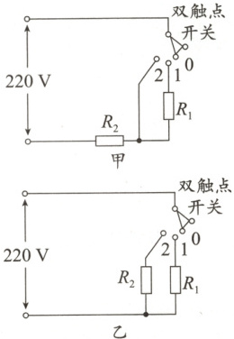 (1)由题图甲可知,当双触点开关置于1时,R₁、R₂串联,根据串联电路的电阻特点可知,此时电路中的总电阻最大,由P = $\frac{U^{2}}{R}$可知,电路中的总功率最小,电热锅处于低温挡;