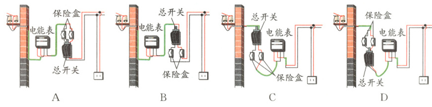 B解析:电能表是测量整个家庭消耗电能多少的仪表,需要安装在最前面;总开关控制整个电路,为了方便检修电路,要安装在电能表的后面;电路中电流过大会熔断保险丝,为了更换保险丝比较方便,保险装置安装在总开关的后面,故B选项正确。