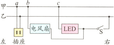 4.(2024·广州中考)如图所示,某家庭电路的输电线甲、乙从右端进户。闭合开关S,LED灯发光、电风扇正常工作,用试电笔检测插座,只有检测右孔时氖管发光。由于出现故障,电风扇停止工作,LED灯仍发光,用试电笔检测插座两孔,氖管均发光。该故障是 ( )