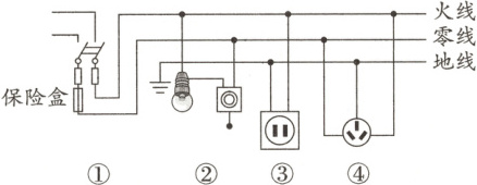 D 解析:保险盒需要接在火线上,故①错误;虽然开关接在火线和接在零线上都能控制灯泡,但是接在火线上,当开关断开时,能切断火线,开关接在零线上,当开关断开时,灯泡连接着火线,不安全,由题图可知,这时的电路中明显的错误是开关接在零线上了,故②错误;双孔插座,与其他用电器并联,接线应为左零右火,题图中连接错误,故③错误;三孔插座的接线应为上孔接地线、左孔接零线、右孔接火线,故④正确,本题选择错误的,①②③错误,故选D。