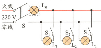 5.电工师傅常用一只额定电压为220V的灯泡L₀(校验灯)代替保险丝来检查新安装的照明电路中每个支路的情况,如图所示,当闸刀开关S闭合后,再分别依次闭合开关S₁、S₂、S₃(每次只能闭合其中之一)时,可能出现三种情况,完成下述现象的判断。(均选填“短路”“断路”或“正常”)