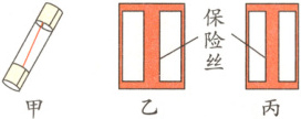 2. (和平模拟)为了防止电流过大将用电器的核心部件烧毁,很多用电器都装有保险管,如图甲所示,保险管内的保险丝是由______(选填“铜线”“合金线”或“橡胶棒”)制成的;乙、丙两图分别是两个保险管的截面图。它们的材料相同,长度相同,粗细不同,当乙、丙两保险管通过相同的电流时,______(选填“乙”或“丙”)保险丝更容易熔断。如果家庭电路中不安装______(选填“空气开关”或“漏电保护器”),那么当电路发生短路时有可能会引起火灾。