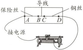 3(教材P111图19.2 - 4改编)家用保险丝一般是用铅锑合金制成,在如图所示的电路中,A、B接线柱间是一段保险丝,C、D接线柱间是一段铜丝。接通电源后通过保险丝和铜丝的电流大小________;向右移动变阻器的滑片发现保险丝先熔断,这是通过________方式改变保险丝的内能,这个过程中电流通过铜丝________(选填“会”或“不