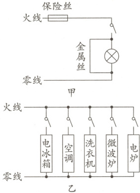B.甲图中,闭合开关后保险丝熔断,原因是电路总功率过大