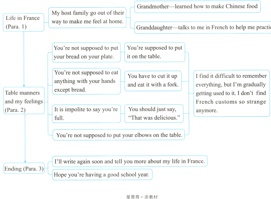 [教材问题答案] 1.Because she is on her student exchange program in France. 2.Yes, she does. This can be seen in the way she talks about her host family:that they are nice and they go out of their way to make her feel at home;that the grandmother makes Chinese food for her;that the granddaughter is kind and talks to her in French to help her practice. 3.It doesn’t worry her as it used to. 4.Her biggest challenge is learning how to behave at the dinner table.
