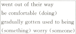1.(something) worry (someone) 2.be comfortable (doing) 3.went out of their way 4.gradually gotten used to being