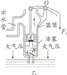1.(山东青岛期中)中秋假期小杰在帮奶奶做家务时,一个给鸡自动喂水的装置引发了他的兴趣。如图甲所示,把一个装满水的瓶子倒放在水盆中,并使瓶口没入水中,鸡喝水的过程中,盆中水位下降至瓶口露出水面时,瓶中水自动流出补充到盆中,直到瓶口再次没入水中,水停止流出,如此反复。经过研究他发现当瓶口没入水中时,瓶内水柱上方的气压______(选填“大于”“小于”或“等于”)外界大气压,所以瓶中水不再流出。小杰还发现奶奶家院子里还有一口压井,通过查资料他明白了这口压井是靠活塞式抽水机来提水的,其某个工作环节如图乙所示,此时活塞向上移动,______阀门关闭,水在______的作用下冲开______阀门,流入圆筒。小杰发现这两个装置的原理是相同的,你身边还有应用相同原理的实例吗?请任意举出两个:______、______。