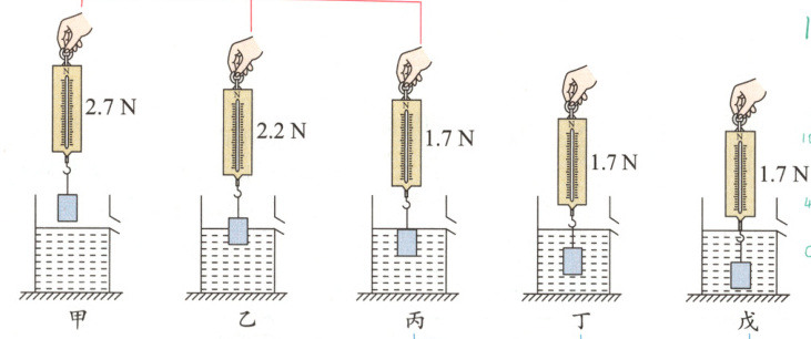 例2(毕节中考)在“探究浮力的大小与哪些因素有关”的实验时,小丽将一个物块挂在弹簧测力计下,并逐渐使其浸入水中,实验过程和对应的实验数据如图甲、乙、丙、丁、戊所示。弹簧测力计示数逐渐变小,浮力变大,此时$V_{排}$也变大。