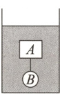 4.(山东聊城模拟)如图所示,底面积为$2×10^{-2}m^{2}$的圆柱形轻质容器放置在水平桌面上,容器内装有适量水,质量为600 g、体积为$150cm^{3}$的金属球B与质量为900 g的物体A用细绳系在一起后放在容器中,静止后他们悬浮在水中,用剪刀将细绳剪断,金属球B下沉,物体A上浮(g取10 N/kg)。求:
