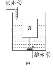 5.(广西南宁十四中期末)如图甲所示是小明设计的自动排水水箱。A是一个面积为$20cm^{2}$圆形的放水阀门(其质量与厚度不计),且恰好能把排水口盖严。A通过长10 cm的细绳与圆柱形浮子B相连,未加水时B在水箱底部,浮子B的底面积为$100cm^{2}$,高为12 cm,细绳质量、体积不计,水箱足够高,当水箱中的水储备到一定量时,阀门A在细绳拉力的作用下被拉开,然后开始排水。某次测试水箱性能时向水箱中缓慢加水,直到阀门刚好被拉起,水箱中水的深度h与加水体积之间的关系如图乙所示,当水深16 cm时,细绳刚好被拉直。求: