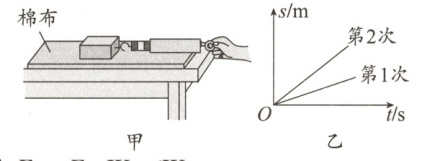 6如图甲所示,木块放在水平面上,用弹簧测力计沿水平方向拉动木块使其做直线运动,在相同水平面上两次拉动同一木块得到s - t关系图像如图乙所示,第1、2两次弹簧测力计示数分别为F₁、F₂,如果运动时间相同,拉力所做的功分别为W₁、W₂,下列判断正确的是 ( )