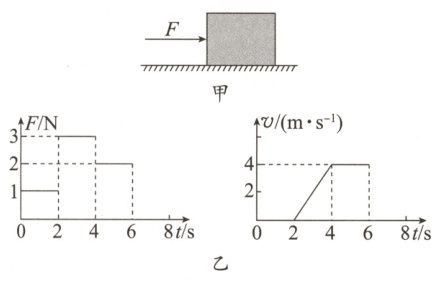 10一只木箱放在水平地面上,地面上各处粗糙程度相同,对木箱施加一个方向不变的水平推力F(如图甲所示);F的大小与时间t的关系、木箱的运动速度v与时间t的关系图像如图乙所示,以下说法正确的是 ( )