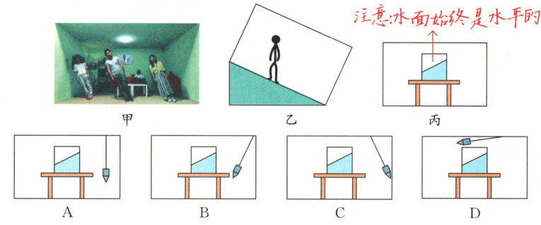 例3 (山东青岛崂山期末)“倾斜小屋”在娱乐场所流行。如图甲所示,人在“倾斜小屋”内要“倾斜”才能站稳,它的原理如图乙所示,把小屋倾斜建设,以给屋内视角的人造成“倾斜站立”的错觉。在屋内桌面放一桶水,静止时,屋内视角如图丙所示。若在屋顶用软绳悬挂一个重锤,则重锤静止时,它的位置应为选项中的 ( )