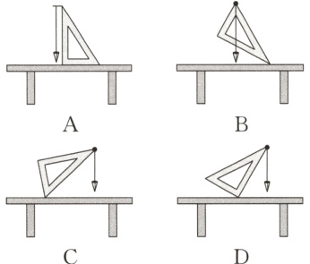 A解析:三角尺有两个直角边,把三角尺竖直放置,一个直角边放在桌面上,另一个直角边放上重垂线,因为重力的方向是竖直向下的,如果重垂线与直角边是平行的,则表明桌面是水平的,故A符合题意,B、C、D不符合题意。
