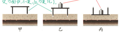 如图所示是“探究影响压力作用效果的因素”实验,如图甲所示,将小桌放在海绵上;如图乙所示,在小桌上放一个砝码;如图丙所示,把小桌翻过来,桌面朝下,并在它上面放一个砝码。压力不变,受力面积变化了。 受力面积不变,压力变化了。
