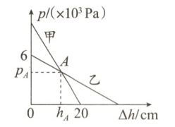 10( 2024·南充中考)(多选)质量分布均匀的实心正方体甲、乙放在水平地面上,将甲、乙沿水平方向切去高度△h,剩余部分对地面的压强p 与h 的关系如图所示,已知 p 甲=6×103 kg/ m3,乙的边长为30 cm,下列选项正确的是(g 取10 N/kg)