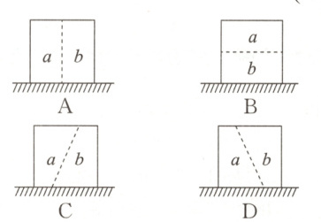 6一个质量分布均匀的立方体静止在水平地面上,沿图中虚线将其分割成体积相等的a ,b 两部分,并取走α部分,剩下的é部分(未倾倒)对水平地面产生的压强最大的是