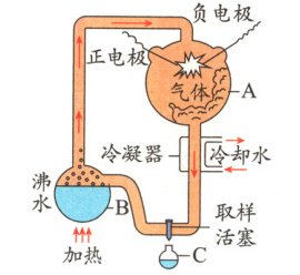 米勒实验:实验装置中B内装入沸水,模拟的是原始海洋;装置中通入的气体模拟了__________;在上部的反应瓶中安装电极,通过火花放电,模拟______,下部装上冷凝器,装入冷却水,模拟的是降雨。