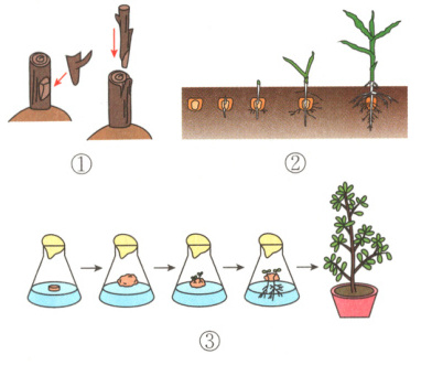 [名师讲习]①是嫁接,操作关键是使接穗和砧木的形成层紧密结合,A正确。③是植物的组织培养,利用组织培养这种技术,可以在短时间内大批量地培育出所需要的植物新个体,繁殖的速度很快,能保持母体优良性状,不能培养出新品种,B正确。②种子萌发时最先突破种皮的结构是胚根,并发育成植物的根,C正确。①③不经过两性生殖细胞的结合,由母体直接产生新个体,属于无性生殖,②种子繁殖属于有性生殖,D错误。