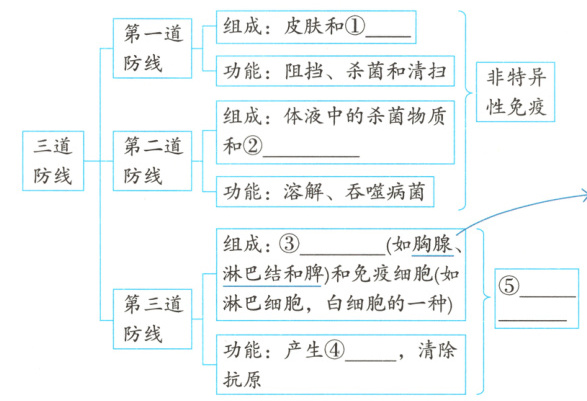 ①黏膜②吞噬细胞③免疫器官④抗体特异性免疫