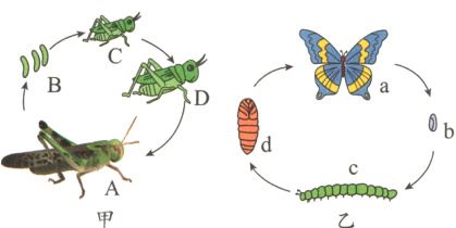 (2) 乙图中昆虫经过 b 卵、c 幼虫、d 蛹和 a 成虫四个时期,属于完全变态发育,家蚕的发育过程与乙图的发育过程相同。(3) 图乙中 d 表示的发育时期叫做蛹。
