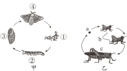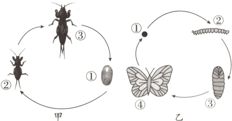 B. 甲的发育会经历受精卵→幼虫→成虫三个阶段