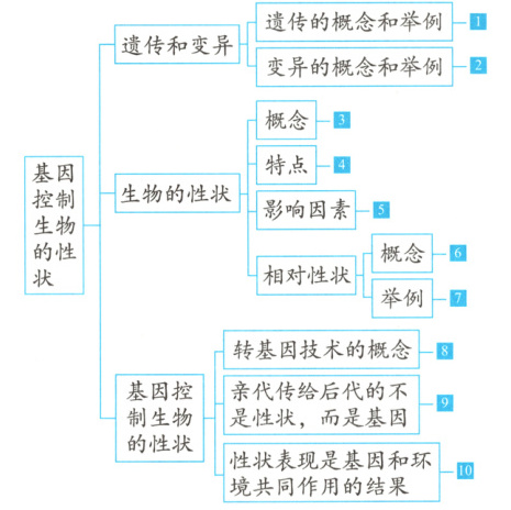 9. 生物的性状是由基因控制的,亲代遗传给后代的不是性状,而是基因;子代因为得到了亲代的基因(遗传信息)才表现出亲代的性状。