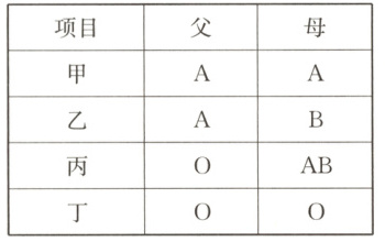 4.人类的ABO血型是由一对遗传因子控制的,而控制此血型的遗传因子有Iᴬ、Iᴮ和i三种形式,其中Iᴬ和Iᴮ是显性,i是隐性,血型和基因型的关系如表(一)所示。表(二)为甲~丁四组父母的血型配对,在不考虑突变的情况下,则表(二)中的何种组别不可能生下O型血型的子女( )