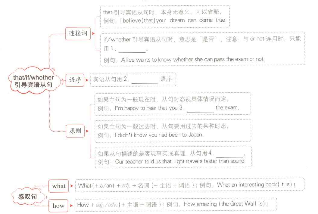 1. that 2. if/whether 3. What an 4. How 5. How【点拨】本句强调的中心词是形容词 amazing,用“How+adj.+主语+谓语!”句型。6. What【点拨】本句强调的中心词是不可数名词 news,用 what 引导感叹句。7. whether【点拨】空格处是宾语从句的引导词,意为“是否”;whether 常与 or not 连用。8. if/whether; If