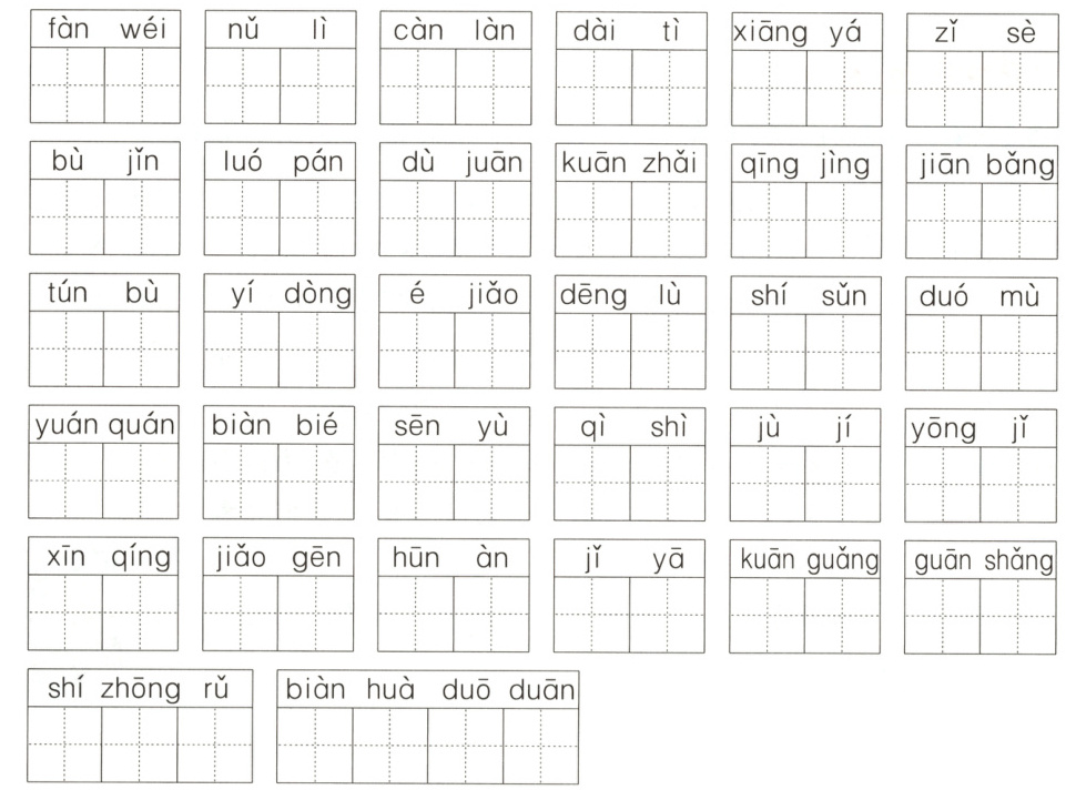 示例:灿烂 围栏 紫色 木柴 仅仅 又大又圆 罗汉 萝卜 杜绝 肚子 移动 多少 乳牙 小孔 源泉 原来