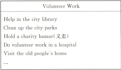 (2022山东泰安中考)让青少年利用课余时间参加志愿者服务活动,对其成长具有重要意义,可以帮助他们学习新技能,增强沟通能力和社会责任感。暑假将至,请根据下面表格中的内容提示,以“My Volunteer Work Plan”为题写一篇英语短文,介绍你选择的活动项目及活动计划,并谈谈参加志愿者服务活动的意义。