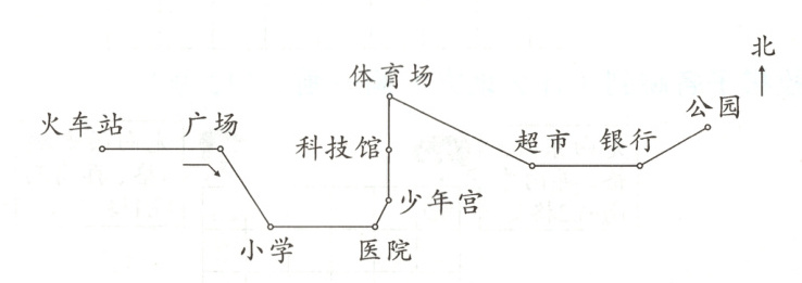 从火车站到广场是向( )走,从医院到小学是向( )走,从少年宫到科技馆是向( )走,从超市到体育场是向( )走,从银行到公园是向( )走。