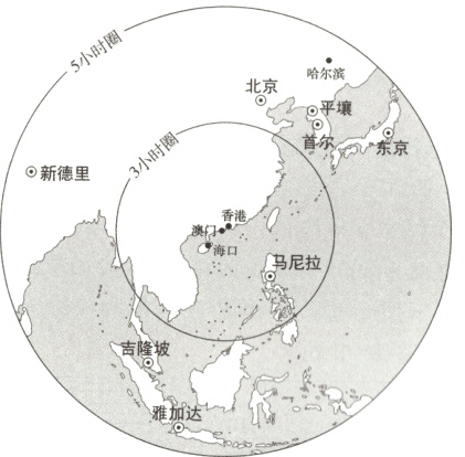 (2022江苏无锡中考)下图为以澳门为中心的某交通运输方式等时线分布示意图。读图,回答9~10题。