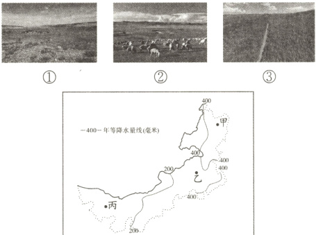 (1)内蒙古自治区位于西北地区,东西跨经度广,受海陆位置影响,自东向西距海越来越远,降水越来越少。据图可知,甲地位于内蒙古自治区东部山区,距海较近,年降水量在400毫米以上,植被以森林为主,与照片③相对应;乙地位于内蒙古自治区中部,距海较远,年降水量在200毫米~400毫米,草场广布,以畜牧业为主,与照片②相对应;丙地位于内蒙古自治区西部,距海最远,降水最少,年降水量在200毫米以下,植被稀疏,以荒漠草原为主,与照片①相对应。