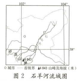 6.A 解析:根据图2中的经纬网和河流流向,可以明确石羊河从祁连山东侧流出,然后向东北方向流动,最终消失在沙漠中。故选A项。