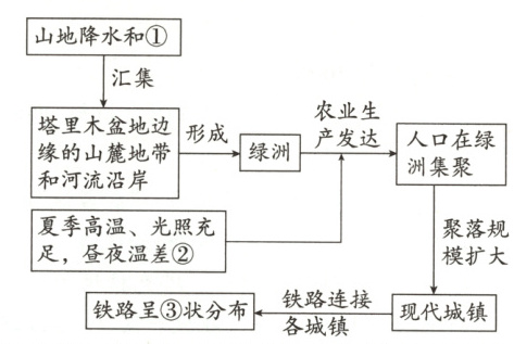 (4)某同学运用结构图探究塔里木盆地现代城镇、铁路分布与水源、绿洲分布的关系,请将结构图中划线部分补充完整①________、②________、③________。