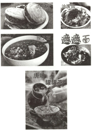 陕西的美食数不胜数,有“山”北边的Biángbiáng面、肉夹馍、臊子面,还有“山”南边的汉中热米皮、略阳罐罐茶。读陕西部分名吃图,回答9~11题。