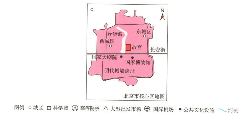 例4《北京城市总体规划(2016~2035年)》对北京城市发展进行了定位。目前,北京正在朝着“国家首都、世界城市、文化名城、宜居城市”的目标迈进。为落实城市战略定位,疏解非首都功能,新的城市规划将全市划分为核心区、中心城区、生态涵养区等区域。读图,回答(1)~(3)题。