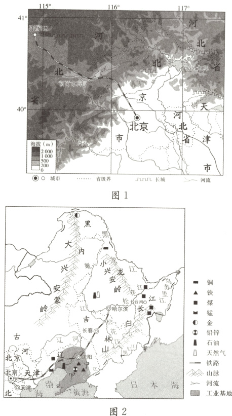 材料三 图1为京张高铁路线图,图2为东北地区图。