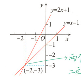 [思路导引]把方程组转化为两个一次函数,即y = 2x + 1与y = x - 1,然后在同一平面直角坐标系内画出图象,找出两个图象的交点坐标即可求解。
