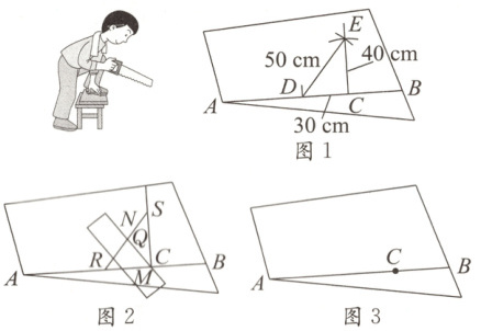 今天,我在书店一本书上看到下面材料:木工师傅有一块如图1所示的四边形木板,他已经在木板上画出一条裁割线AB,现根据木板的情况,要过AB上的一点C,作出AB的垂线,用锯子进行裁割,然而手头没有直角尺,怎么办呢?